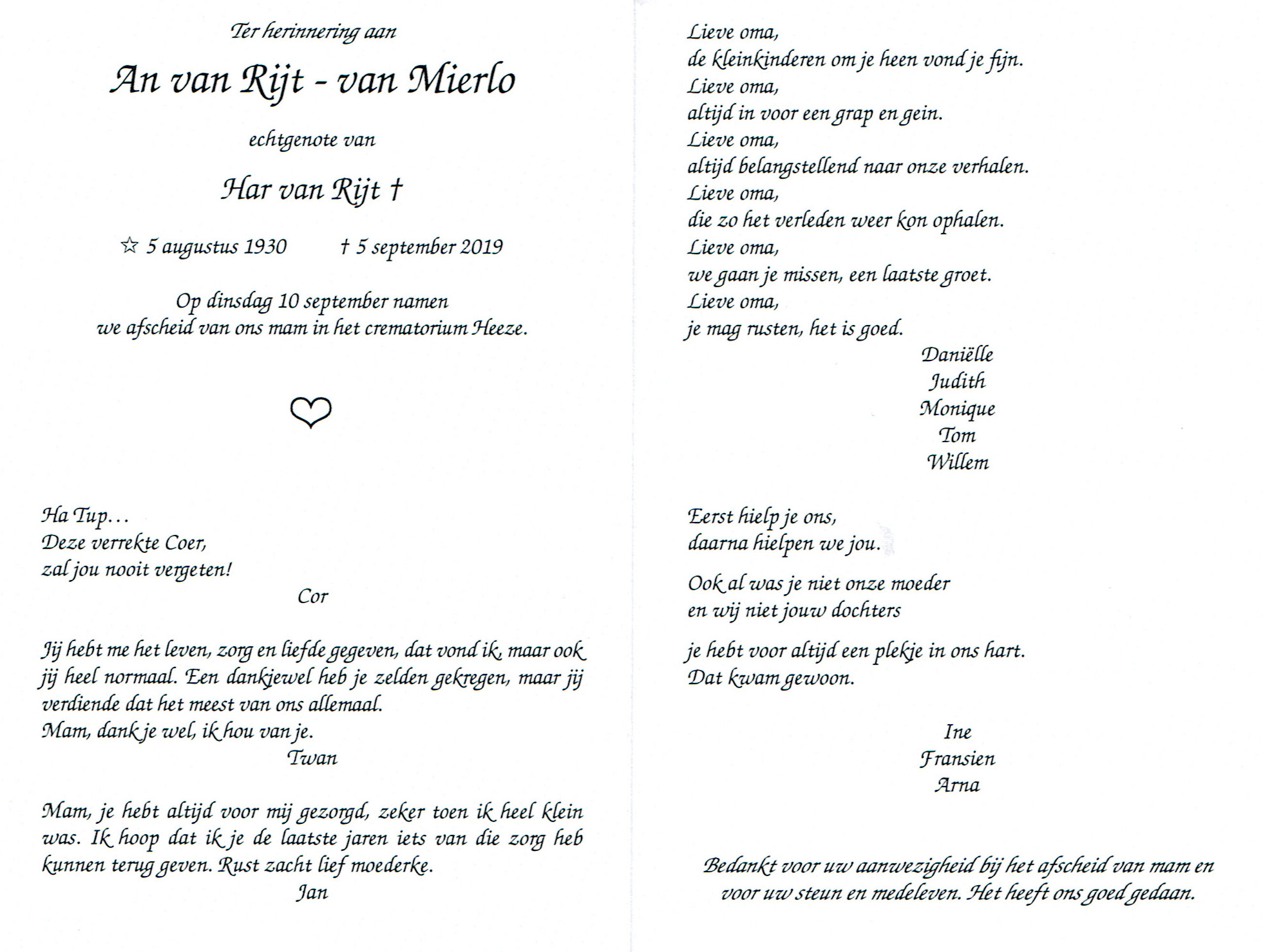 An van Rijt-van Mierlo 1930-2019