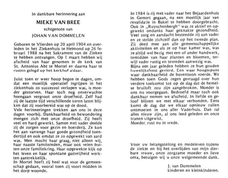 Johanna Maria (Mieke) van Dommelen-van Bree 1903-1988 Johanna Maria (Mieke) van Dommelen-van Bree 1903-1988 Drukfout op het prentje volgens de geboorteakte is het geboortejaar niet 1904 maar 1903