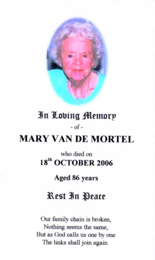 Mary van de Mortel-Flavel 1920-2006 Mary van de Mortel-Flavel 1920-2006 Rusten in de urnenmuur in Neerkant